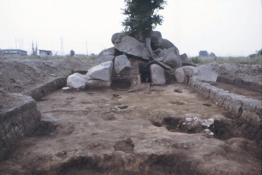 岩塚古墳は、千僧供古墳群のうち最も南側に位置し、墳丘約27.5mの円墳であることが確認されていますが、明確な周濠は認められていません。幅2m、長さ11mの横穴式石室が露出しており、古墳時代後期(6世紀末頃)の築造と考えられています。