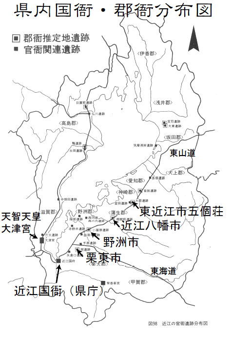 御館前遺跡は、古代東山道の通過地にあたり、蒲生・日野・鈴鹿へと抜ける道の始発点でもある交通の要所に位置しています。奈良時代から平安時代の蒲生郡衙(ぐんが)に関連する可能性の高い遺構群が確認されており、東西南北に整然と並ぶ大型の掘立柱(ほったてばしら)建物群と、これらの建物を取り囲むように配置された塀跡・堀跡、一般集落とは異なる官衙(かんが)的色彩が濃い遺物が多く見つかっています。